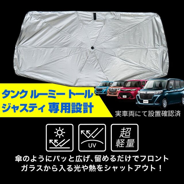 車種専用設計でぴったりフィット タンク ルーミー ジャスティトール 前期 後期 専用 収納袋つき 傘型サンシェード です。 [ 材質 ] 生地:シルバー塗装ポリエステル、骨:グラスファイバー [ カラー ] 表面:シルバー/裏面:ブラック [ セット内容 ] 1p [ 装着方法 ] コンパクト収納ワンプッシュ展開で簡単装着 ■適合車種 タンク/ルーミー/トール/ジャスティ M900A M910A H28.11~ 全グレード対応