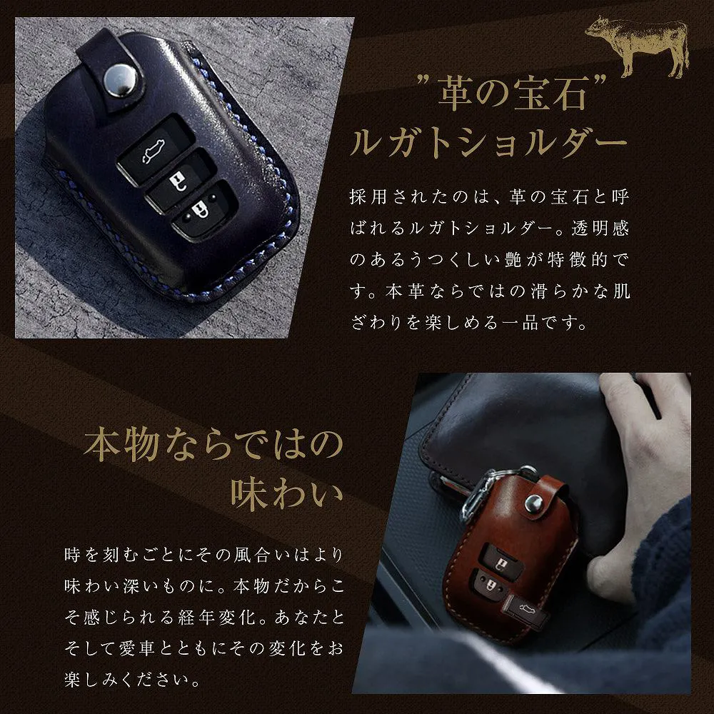 ベルギー産ルガトショルダーを贅沢使用。 奥行のある美しい艶が特徴的な完全ハンドメイドのオリジナル スマートキーカバーです。スマートキーのサイズにぴったりジャストフィット。 滑らかな質感であなたの所有感を満たします。