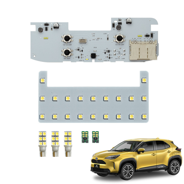 ヤリスクロス 前期専用のLEDルームランプセットは、フロント、リア、バニティ、ラゲッジの全てをカバーするフルセットです。純正のルームランプでは物足りないと感じる方に最適で、明るく美しい光を提供します。専用設計により、車内の雰囲気を一新し、快適なドライブをサポートします。トヨタ車のカスタムパーツとして、車内をより魅力的に演出します。