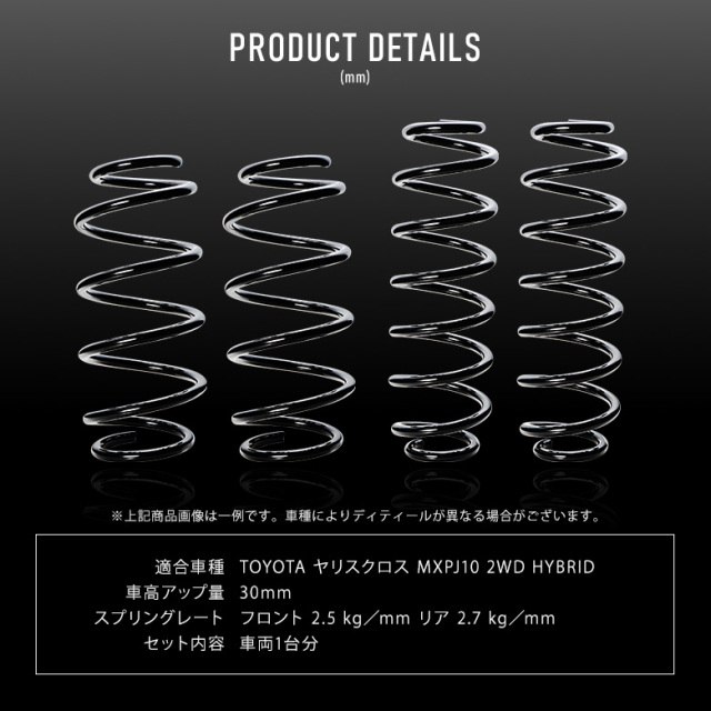 リフトアップでアクティブな車両にカスタマイズできるリフトアップスプリングです。 [ 材質 ]SUP9/SAE9254 [ 車高アップ量 ] 30mm [ スプリングレート ]フロント 2.5 kg/mm リア 2.7 kg/mm [ 適合車種 ]ヤリスクロス MXPJ10 2WD HYBRID