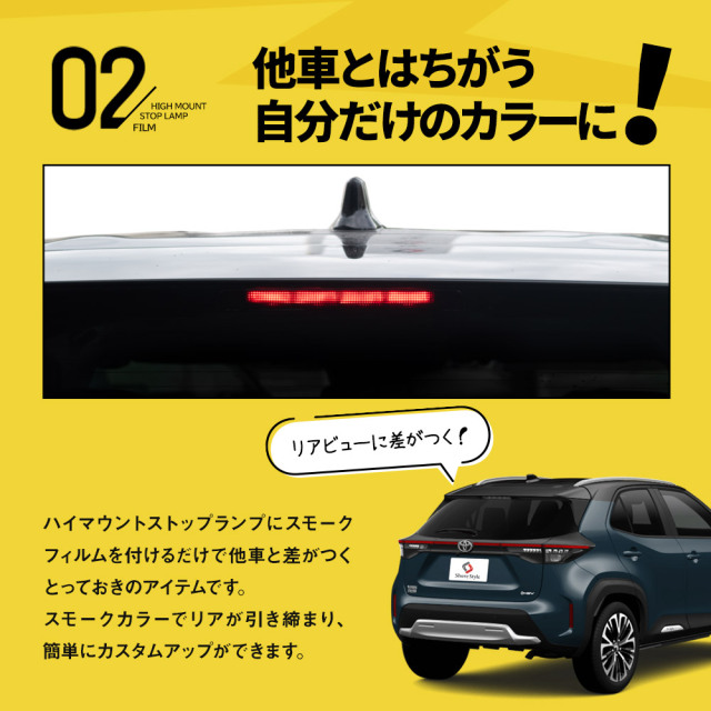スモークカラーで引き締まるリアビュー カット済み ヤリスクロス 前期 後期 ハイマウントストップランプフィルム スモーク 1Pです。 [ 材質 ] PVC [ カラー ] スモーク [ セット内容 ] 1P [ 装着方法 ] フィルム表面にヒートガンやドライヤーの熱をあてしっかり貼り付け! ■適合車種 ヤリスクロス 前期 後期 全グレード対応 MXPJ1#・MXPB1# R2.9~