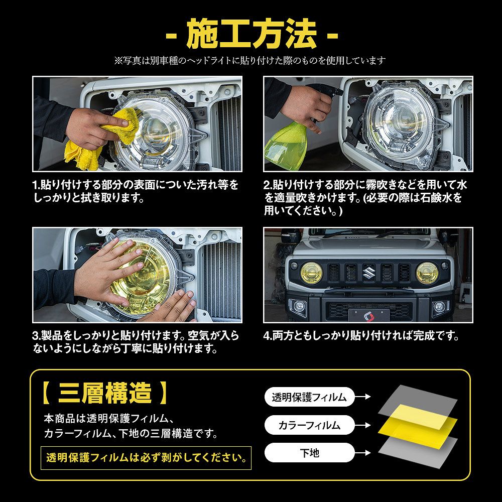 | ※フィルム貼付時にアルコール系の溶剤はご使用できません。素材を痛める場合がございます。水または石鹸水のご使用を推奨いたします。 ※こちらは保証対象外商品です。 ※貼り付け部分のサイズをあらかじめご確認のうえでご購入下さい。 ※貼付時のヒートガンやドライヤーご使用の際は火傷などに十分注意して作業して下さい。また、プラスチック面やバンパーなどが溶けないように注意して作業をお願いいたします。 ※貼り付けの際は車体ボディの脱脂やゴミ取りを入念に行ってください。 ※装着後24時間は走行しないでください。剥離の原因になります。 ※色味につきましては仕様変更や生産ロットによって若干異なる場合がございます。 ※グレード・追加オプション・エアロパーツ・社外品等を装着している車によっては形状が合わない場合があります。お乗りのお車と商品画像を見比べて合うことをご確認の上、ご購入をお願いいたします。 ※車両適合情報は本製品発売時のものになります。その後の車両側の仕様変更や改修によっては正常に動作/適合しない場合がありますのでご注意ください。 ※取り付けの際の工賃等の請求は一切受け付けません。 ※お取り付けは、自己責任にて、作業を行って下さい。お客様責任による破損での対応は受付できません。 ※必ずフィッティング確認を行ってから取り付けてください。 ※社外品につき小傷等がある場合がございますが、使用に支障がない限り交換、返品はいたしません。 ※本製品を使用したことによる直接、間接的に生じた事故、損害、破損についての責任は弊社は一切負いません。 ※モニターの環境により商品の色合いや素材感などが異なる場合がございます。 ※商品は予告なく仕様変更もしくは販売終了している場合がございますのであらかじめご了承ください。 ※国外への配送はEMSでの発送です。ご注文後、弊社よりメールにて別途送料などをお知らせいたします。 |